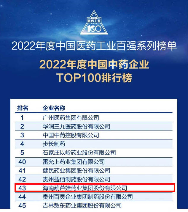 扑克之星药业集团连续4年荣登“中国中药企业TOP100排行榜”,排名上升至第43位